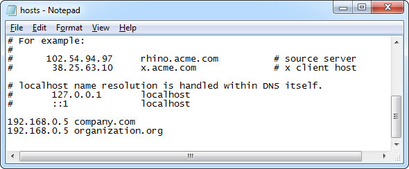 Ví dụ như, nếu có một web server với địa chỉ IP cục bộ 192.168.0.5 dùng cho cả company.com và organization.org, bổ sung dòng sau đây vào file hosts trên máy tính: