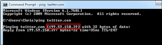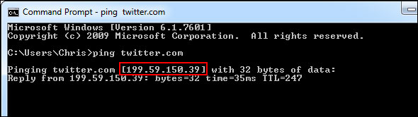 Trước tiên, chúng ta cần biết địa chỉ IP trang Twitter. Tìm địa chỉ bằng câu lệnh ping trong cửa sổ lệnh (nhấn Start, gõ Command Prompt và nhấn Enter). Gõping twitter.com vào cửa sổ lệnh để xem địa chỉ IP của trang.