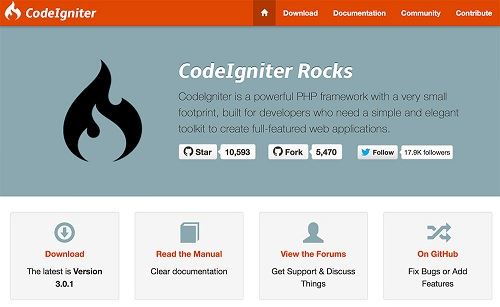 CodeIgniter là một PHP framework rất nhẹ và đã có tuổi đời gần 10 năm (được phát hành vào năm 2006). CodeIgniter có quá trình cài đặt rất đơn giản và chỉ đòi hỏi cấu hình tối thiểu. Vì thế mà framework này sẽ giúp bạn tiết kiệm được rất nhiều chi phí phát sinh. CodeIgniter cũng là một sự lựa chọn lý tưởng nếu bạn muốn tránh sự xung đột giữa các phiên bản PHP bởi vì nó hoạt động mượt mà trên hầu hết các nền tảng lưu trữ và chia sẻ.
