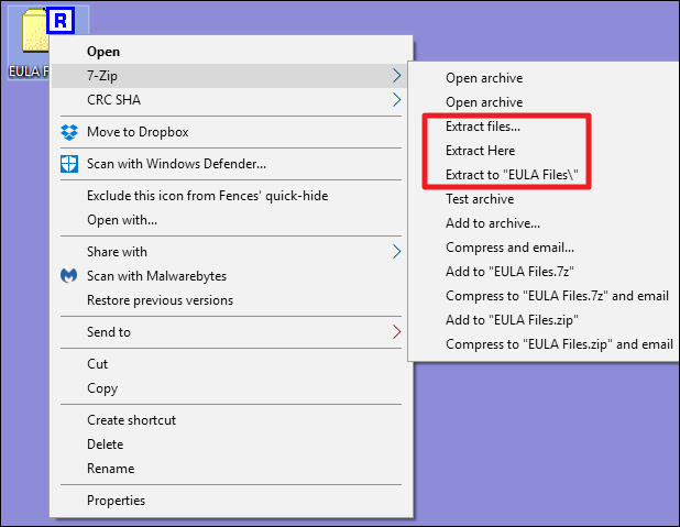 Nếu bạn muốn chỉ giải nén tập tin, bạn có thể làm thao tác này mà không cần mở ứng dụng 7-Zip. Bấm chuột phải vào tập tin RAR, chỉ vào lựa chọn “7-Zip”, và sau đó chọn một trong các tùy chọn “Extract”, tùy thuộc nơi mà bạn muốn giải nén tập tin. Lưu ý rằng nếu bạn có các tập tin RAR được chia ra nhiều phần, bạn sẽ phải giải nén tập tin đầu tiên trong toàn bộ tập tin RAR.